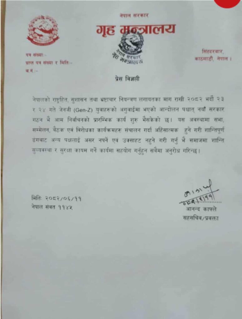 मन्त्रालयले भनेको छ– ‘नेपालको राष्ट्रहित, सुशासन तथा भ्रष्टाचार नियन्त्रण लगायतका माग राखी भदौ २३ र २४ गते जेनजी युवाहरूको अगुवाइमा भएको आन्दोलन पश्चात् नयाँ सरकार गठन भई आम निर्वाचनको प्रारम्भिक कार्य सुरु भैसकेको छ । यस अवस्थामा सभा, सम्मेलन, बैठक एवं विरोधका कार्यक्रमहरू सञ्चालन गर्दा अहिंसात्मक हुने गरी शान्तिपूर्ण ढङ्गबाट अन्य पक्षलाई असर नपर्ने एवं उक्साहट नहुने गरी गर्नु भई समाजमा शान्ति सुव्यवस्था र सुरक्षा कायम गर्ने कार्यमा सहयोग गर्नुहुन सबैमा अनुरोध गरिन्छ ।’