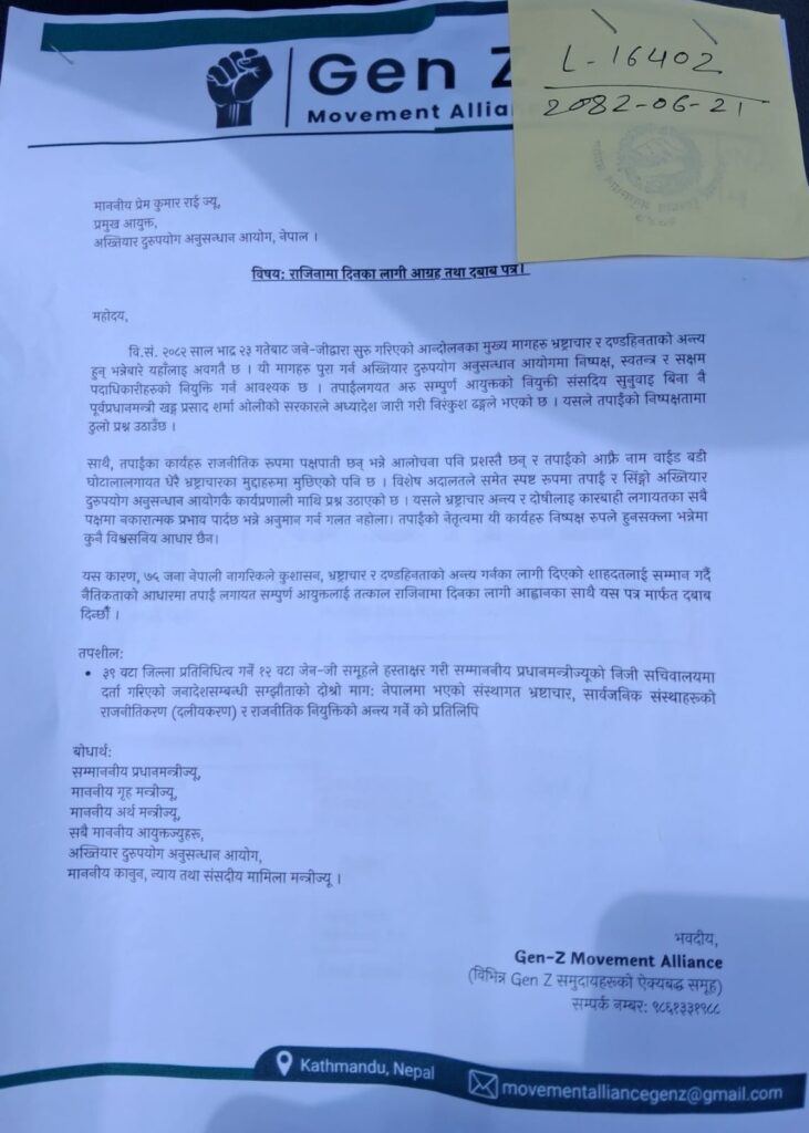 संसदीय सुनाइबिनानै आयुक्तहरू नियुक्त भएको, प्रमुख आयुक्त वाइड बडी घोडलामा मुछिएकोलगायत कारण देखाउँदै पत्रमा राजीनामा माग गरिएको छ।