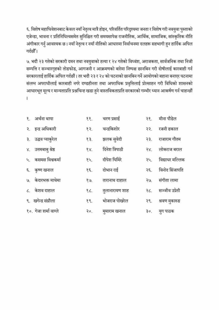 जेन–जी विद्रोहपछि सिर्जना भएको विशेष र असाधारण राजनीतिक परिवेशलाई मध्यनजर गर्दै लोकतान्त्रिक अभ्यास अनुसार विघटित संसदमा प्रतिनिधित्व गर्ने सबै दलले अविलम्ब विशेष महाधिवेशन गरी ती दलले नयाँ नेतृत्व चयन गर्नु आवश्यक रहेको उनीहरूको ठहर छ । ‘यसैगरी विशेष महाधिवेशनबाट दललाई मौलिक रूपमा पुनर्गठन र रूपान्तरण गर्नु आवश्यक छ । यदि जनभावना अनुसार दलले आफूलाई पुनर्गठन, रूपान्तरण र शुद्धीकरण नगरे थप अलोकप्रिय, कमजोर र अनुत्तरदायी हुने भन्ने वास्तविकता पनि स्मरण गराउन चाहन्छौँ’, सात बुँदे अपिलमा भनिएको छ ।