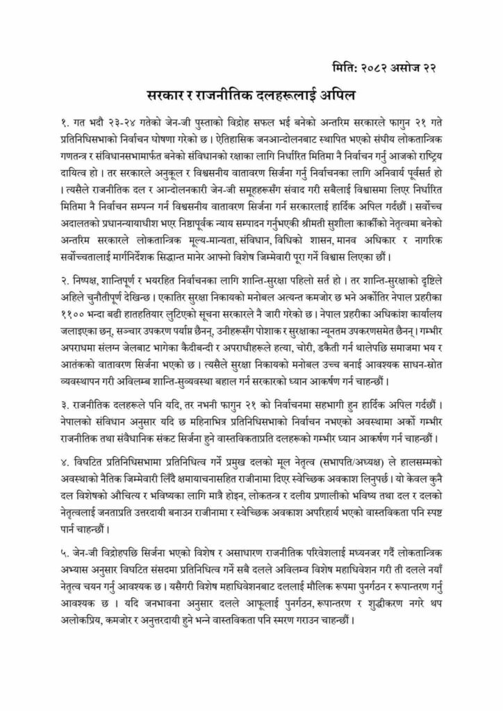 कृष्ण खनाल, केदारभक्त माथेमा, केशव दाहाल,खगेन्द्र सङ्ग्रौला,गेजा शर्मा वाग्ले,चरण प्रसाईँ, चन्द्रकिशोर, झलक सुवेदी लगायत ३० जना नागरिक अगुवाले बुधबार संयुक्त अपिल जारी गर्दै यस्तो आग्रह गरेका हुन् । अगुवाले राजनीतिक दल र जेनजी समूहलाई विश्वासमा लिएर निर्धारित मितिमै निर्वाचन सम्पन्न गर्न विश्वसनीय वातावरण सिर्जना गर्न सरकारलाई अपिल गरेका हुन् ।