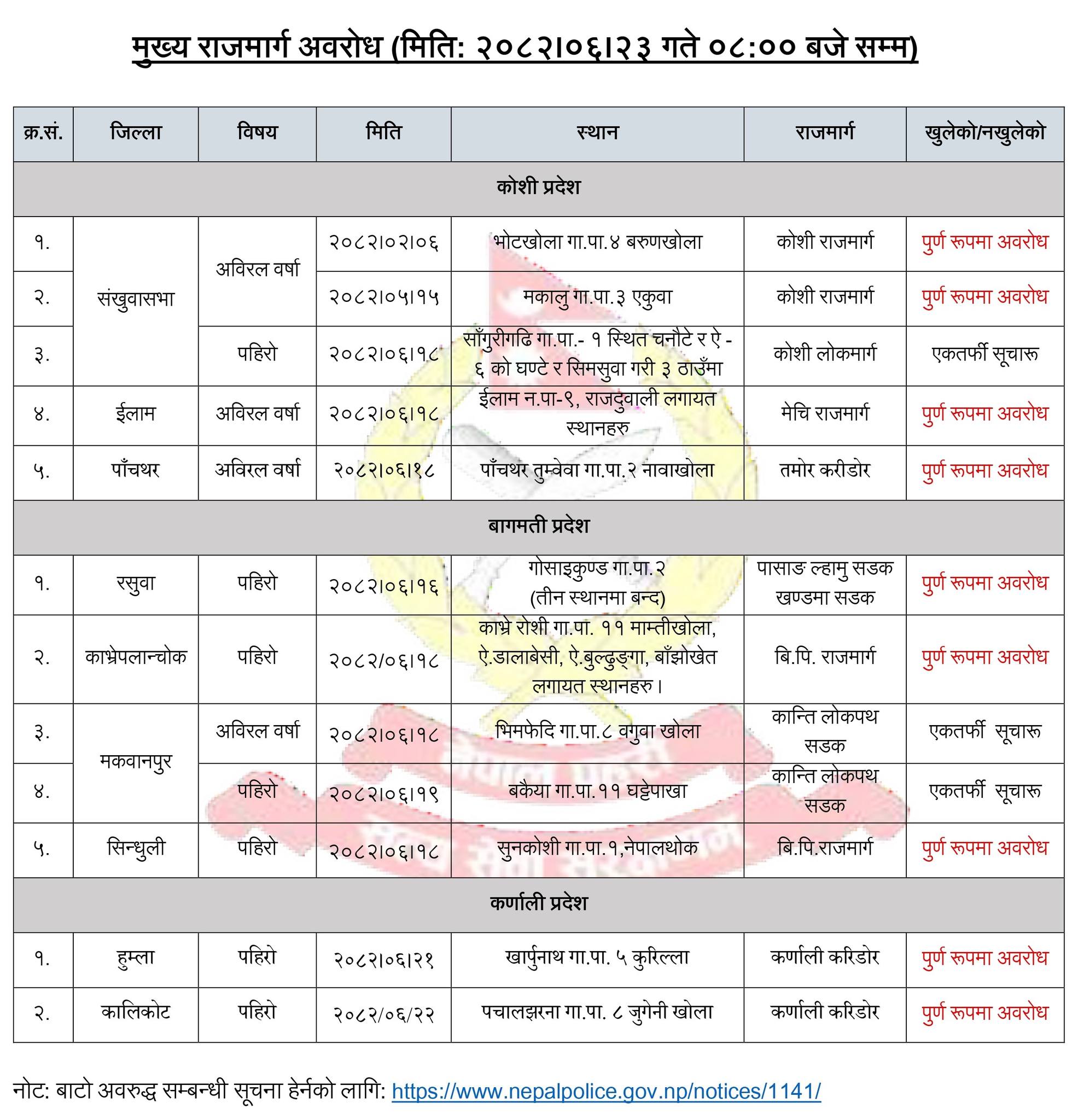 यसैगरी कर्णाली प्रदेश अन्तर्गत रहेका हुम्लाको कर्णाली करिडोरको खर्पुनाथ गाउँपालिका-५ कुरिल्ला सडक र कालिकोटको पचाल झरना गाउँपालिका-८ जुगेनी खोलामा रहेको सडक पूर्ण रूपमा अवरूद्ध रहेको छ ।
