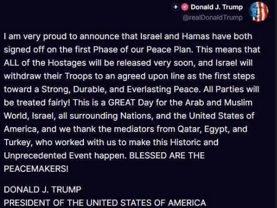 काठमाडौं ।  अमेरिकी राष्ट्रपति डोनाल्ड जे. ट्रम्पले इजरायल र हमासले अमेरिकाको प्रस्तावित गाजा शान्ति योजनाको पहिलो चरणमा हस्ताक्षर गरेको घोषणा गरेका छन् । ट्रम्पले आफ्नो सामाजिक सञ्जालमार्फत प्रकाशित वक्तव्यमा यस सम्झौताअनुसार सबै बन्धकहरू छिट्टै मुक्त गरिने बताए । उनले यसलाई बलियो, दीगो र स्थायी शान्तिको पहिलो कदम भनेर वर्णन गरेका छन्।