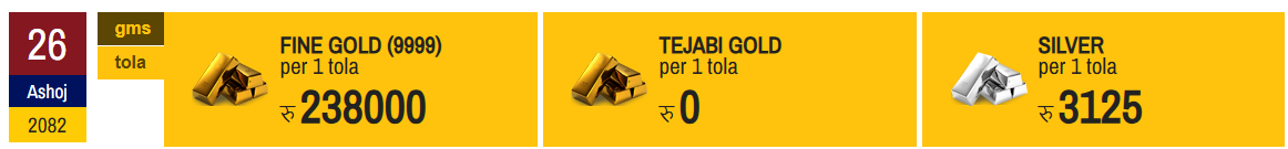 काठमाडौं । आइतबार सुनचाँदीको मूल्य बढेको छ । नेपाल सुनचाँदी व्यवसायी महासंघका अनुसार सुनको मूल्य प्रतितोला ३ हजार रुपैयाँले बढेर २ लाख ३८ हजार रुपैयाँ कायम भएको छ । त्यसैगरी, चाँदीको मूल्य ४० रुपैयाँले बढेर प्रतितोला ३ हजार १२५ रुपैयाँ कायम भएको छ । गत शुक्रबार सुनको भाउ २ लाख ३५ हजार र चाँदीको भाउ ३ हजार ८५ रुपैयाँ थियो ।