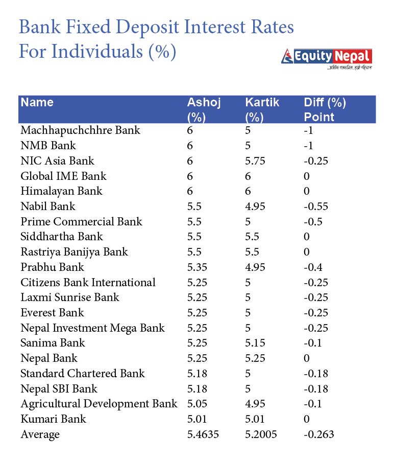 हाल सञ्चालनमा रहेका २० वाणिज्य बैंकहरुमध्ये १४ बैंकहरुले ब्याजदर घटाएका छन् । बाँकी ६ वाणिज्य बैंकहरुले भने व्यक्तिगत मुद्दति निक्षेपको अधिकतम ब्याजदर असोज महिनाकै यथावत् राखेका छन् । त्यस्तै, बैंकहरुले संस्थागत मुद्दति निक्षेपको अधिकतम औषत ब्याजदर ०.२२ प्रतिशतविन्दुले घटाएका छन् ।