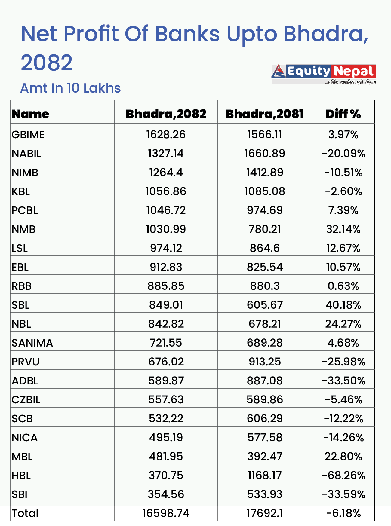 तथ्यांक अनुसार वाणिज्य बैंकहरुमध्ये सबैभन्दा धेरै नाफा कमाउनेमा ग्लोबल आइएमई बैंक अगाडि छ । यसले २ महिनामा १ अर्ब ६२ करोड नाफा कमाएको छ । त्यसपछि, नबिलले १ अब ३२ करोड, नेपाल इन्भेष्टमेन्ट मेगाले १ अर्ब २६ करोड, कुमारीले १ अर्ब ५ करोड, प्राइम कमर्सियलले १ अर्ब ४ करोड र एनएमबिले १ अर्ब ३ करोड नाफा आर्जन गरेको छ । बाँकी बैंकहरुको नाफा १ अर्ब भन्दा कम छ ।