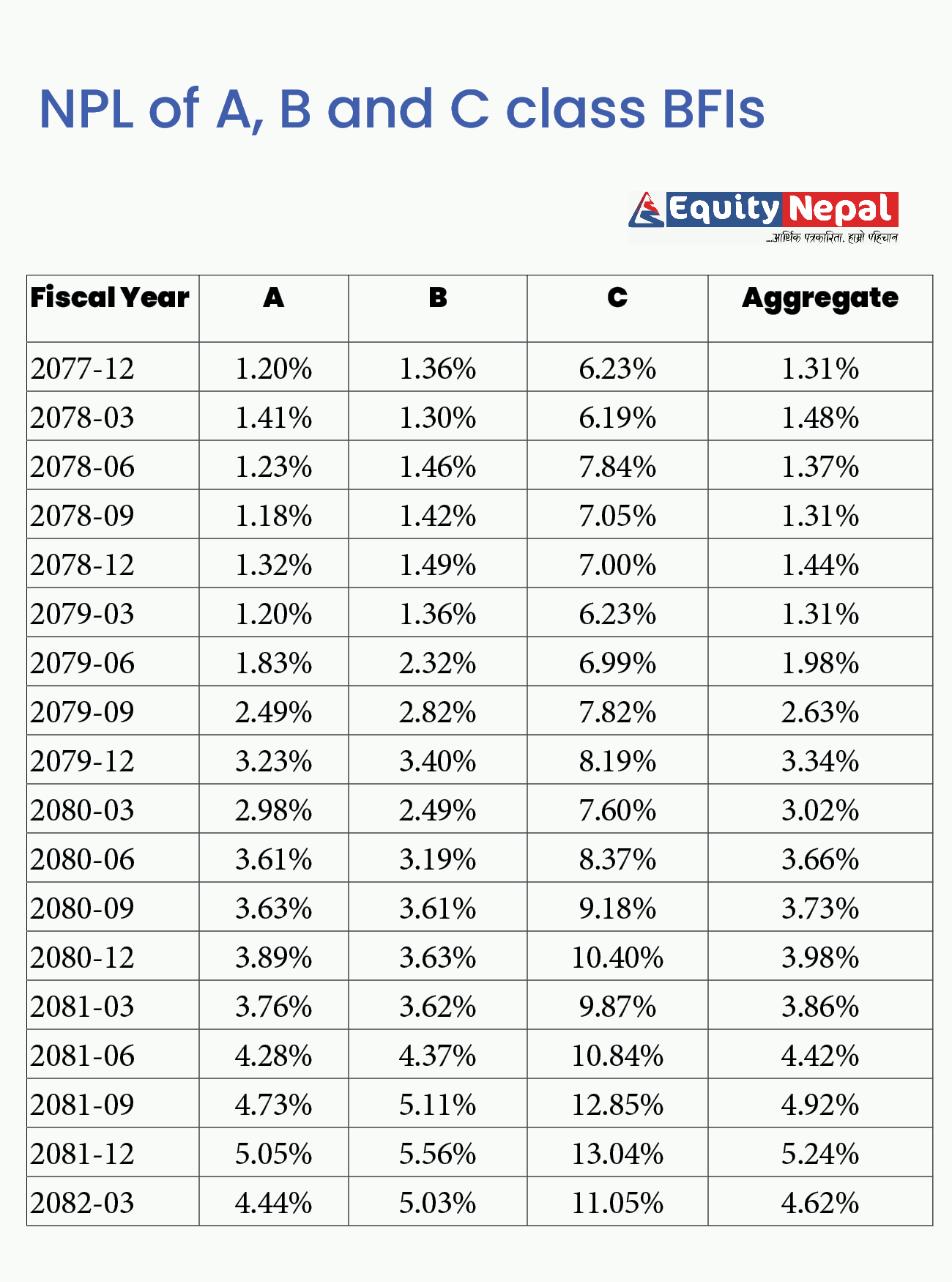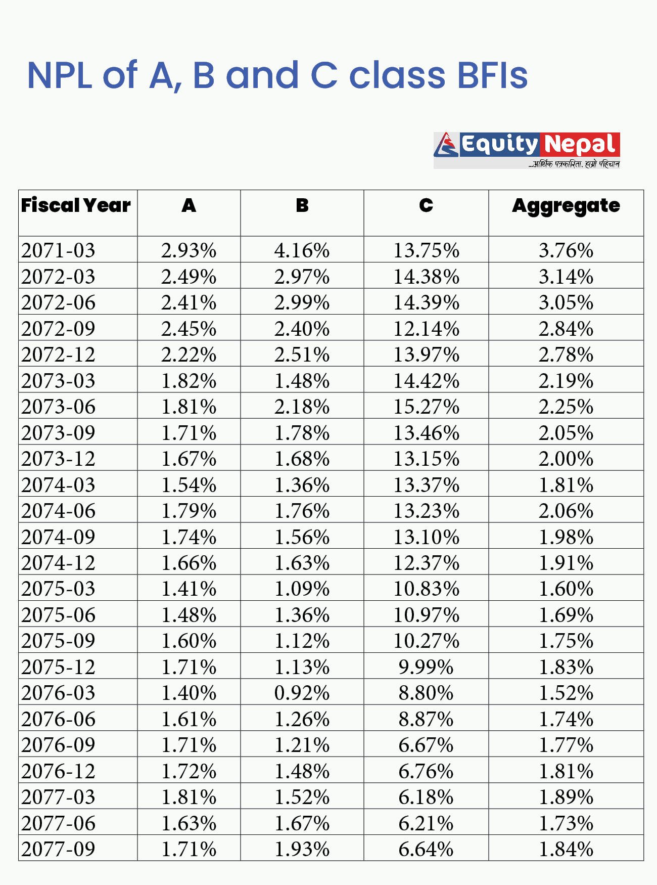 जबकि, वाणिज्य र विकास बैंकहरुको उक्त कर्जा अनुपात क्रमशः ४.४४ प्रतिशत र ५.०३ प्रतिशत देखिएको छ । आर्थिक वर्ष २०७०-७१ मा वाणिज्य बैंकको एनपीएल २.९३ प्रतिशत थियो । विकास बैंकको निष्कृय अनुपात ४.१४ थियो भने फाइनान्सहरुको उक्त अनुपात १३.७५ प्रतिशत थियो । यसअवधिसम्म आइपुग्दा ११.०५ प्रतिशत पुगेको छ । यसबीच थुप्रै उतारचढाव आएपनि फाइनान्सहरुको एनपीएल बैंकहरुको भन्दा २ गुणा बढी नै छ ।