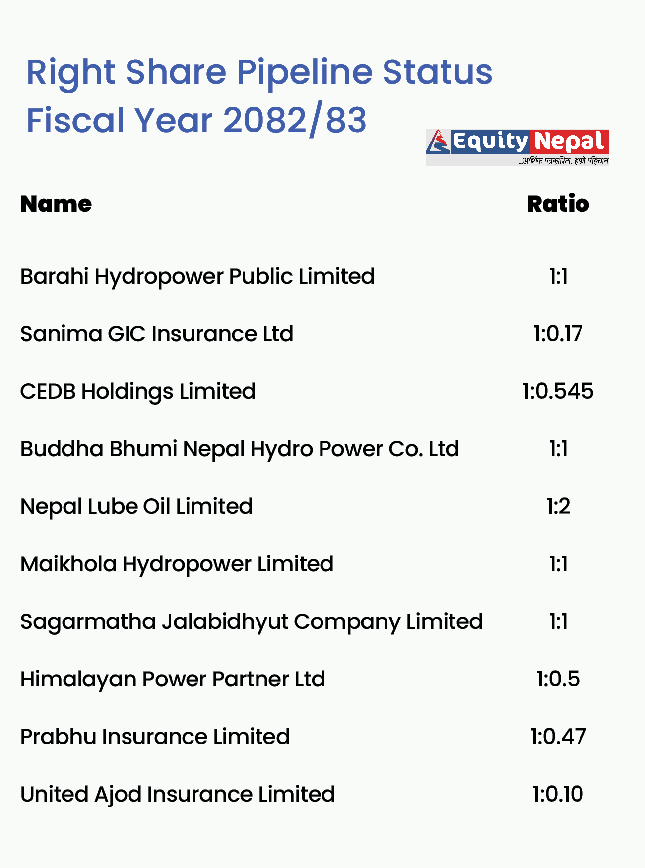 जसअनुसार नेपाल ल्यूब आयलले २०० प्रतिशत हकप्रद बिक्री गर्न नेपाल धितोपत्र बोर्डसँग अनुमति मागेको छ । त्यस्तै, बुद्ध भूमि, सगरमाथा, बाराही र माईखोलाले १०० प्रतिशत हकप्रद जारी गर्ने भएका छन् । यी कम्पनीहरुले नयाँ आयोजनामा लगानी गर्न साथै, बैंकको कर्जा तिर्नका लागि हकप्रद जारी गर्न लागेका हुन् ।