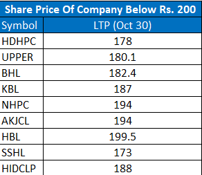 सूचीकृत ९ वटा कम्पनीको बजार भाउ प्रतिकित्ता २०० रुपैयाँ भन्दा कम छ । जसअनुसार शिवश्री हाइड्रोपावरको सेयर भाउ सबैभन्दा सस्तो छ । बिहीबारको अन्तिम कारोबार अनुसार यस कम्पनीको सेयर मूल्य १७३ रुपैयाँ छ ।