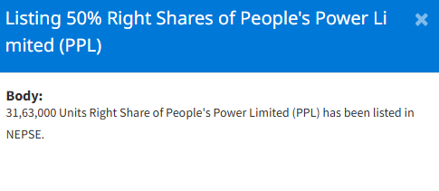 काठमाडौं । नेपाल स्टक एक्सचेन्ज (नेप्से)मा पिपुल्स पावर  लिमिटेको ३१ लाख ६३ हजार कित्ता हकप्रद सेयर  सूचीकृत भएको छ। यस कम्पनीले सेयरधनीहरुलाई जारी गरेको ५० प्रतिशत हकप्रद सूचीकृत भएको छ । उक्त सेयर डिम्याट खातामा जम्मा भएपछि कारोबार गर्न सकिनेछ।