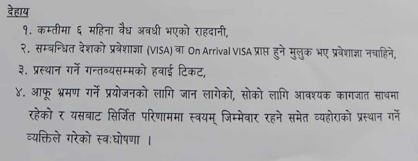 जस अन्तर्गत कम्तीमा ६ महिना वैध अवधी भएको राहदानी हुनुपर्ने छ । यसैगरी, सम्बन्धित देशको प्रवेशाज्ञा (VISA) वा On Arrival VISA प्राप्त हुने मुलुक भए प्रवेशाज्ञा नचाहिने अध्यागमन विभागले जनाएकाे छ ।