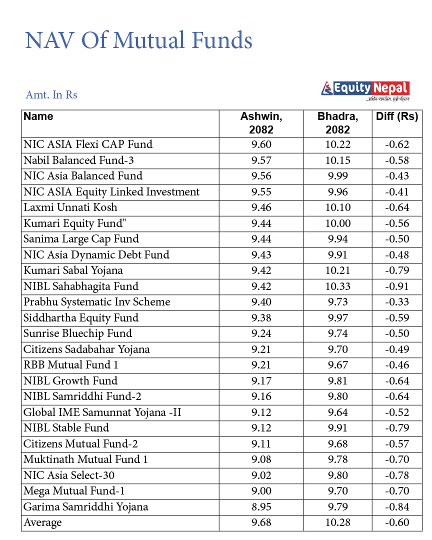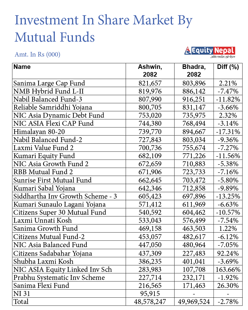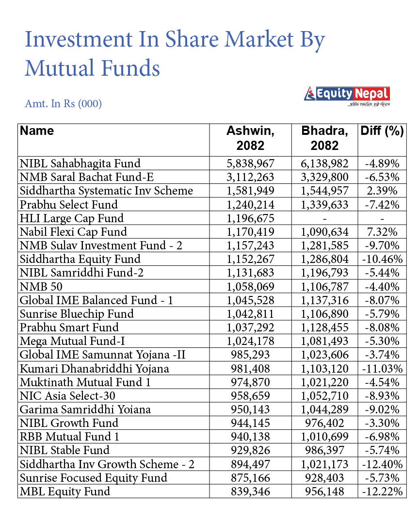गएको भदौमा ६ अर्ब १३ करोड रुपैयाँ लगानी थियो । एनएमबि सरल बचतको ३ अर्ब ११ करोड लगानी रहेको छ । १४ वटा फन्डहरुको लगानी १ अर्ब भन्दा धेरै छ । समग्रमा म्युचुअल फन्डहरुले ४८ अर्ब ५७ करोड रुपैयाँ सेयर बजारमा लगानी गरेका छन् । यो अघिल्लो महिनाको भन्दा २.७८ प्रतिशत कम हो ।