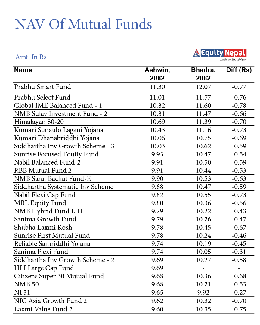 प्रभु स्मार्ट फन्डको न्याभ सबैभन्दा धेरै ११.३० रुपैयाँ छ । त्यस्तै, प्रभु सेलेक्ट फन्डको न्याभ ११.०१ रुपैयाँ छ । ५२ मध्ये ८ वटाको न्याभ १० रुपैयाँ भन्दा धेरै छ । बाँकीको न्याभ १० भन्दा कम छ ।