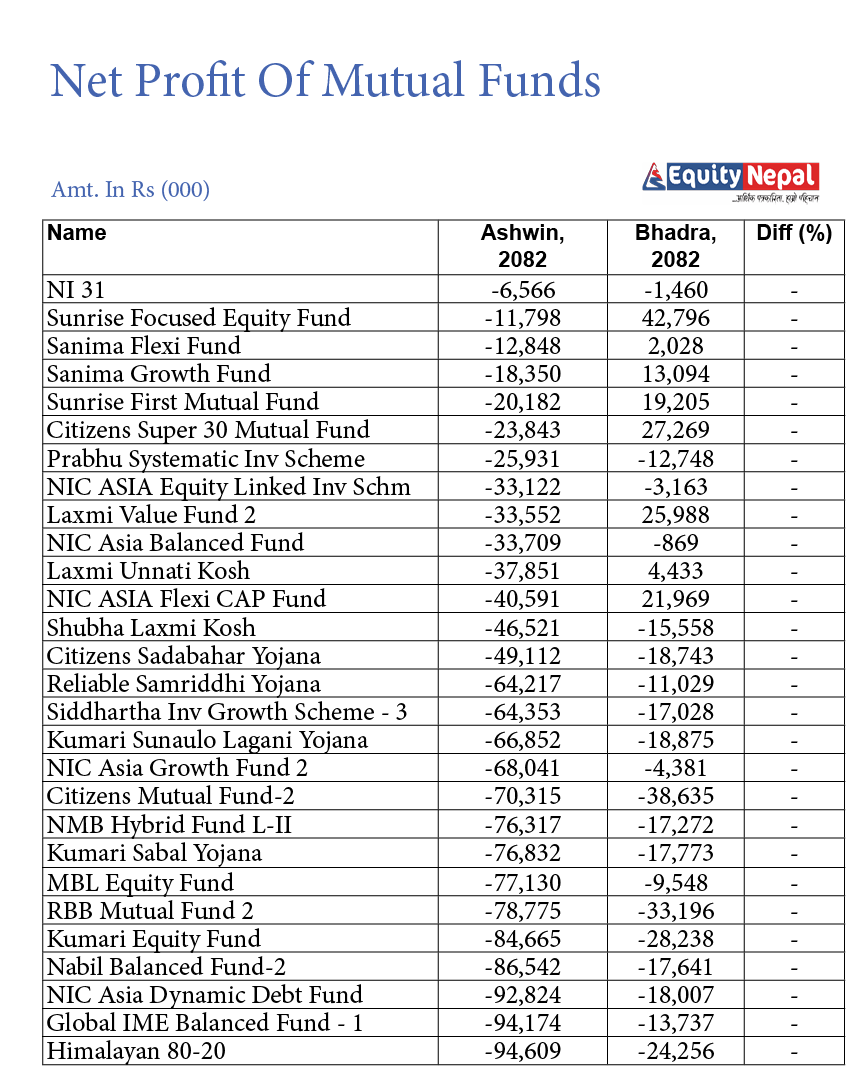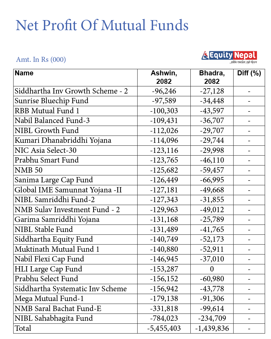 सञ्चालनमा रहेका म्युचुअल फन्डहरुले असोज महिनामा ५ अर्ब ४५ करोड रुपैयाँ घाटा व्यहोरेका छन् । अघिल्लो महिना यिनीहरुले १ अर्ब ४३ करोड नोक्सानी व्यहोरेका थिए । सञ्चालनमा रहेका सबै फन्डहरु घाटामा छन् ।