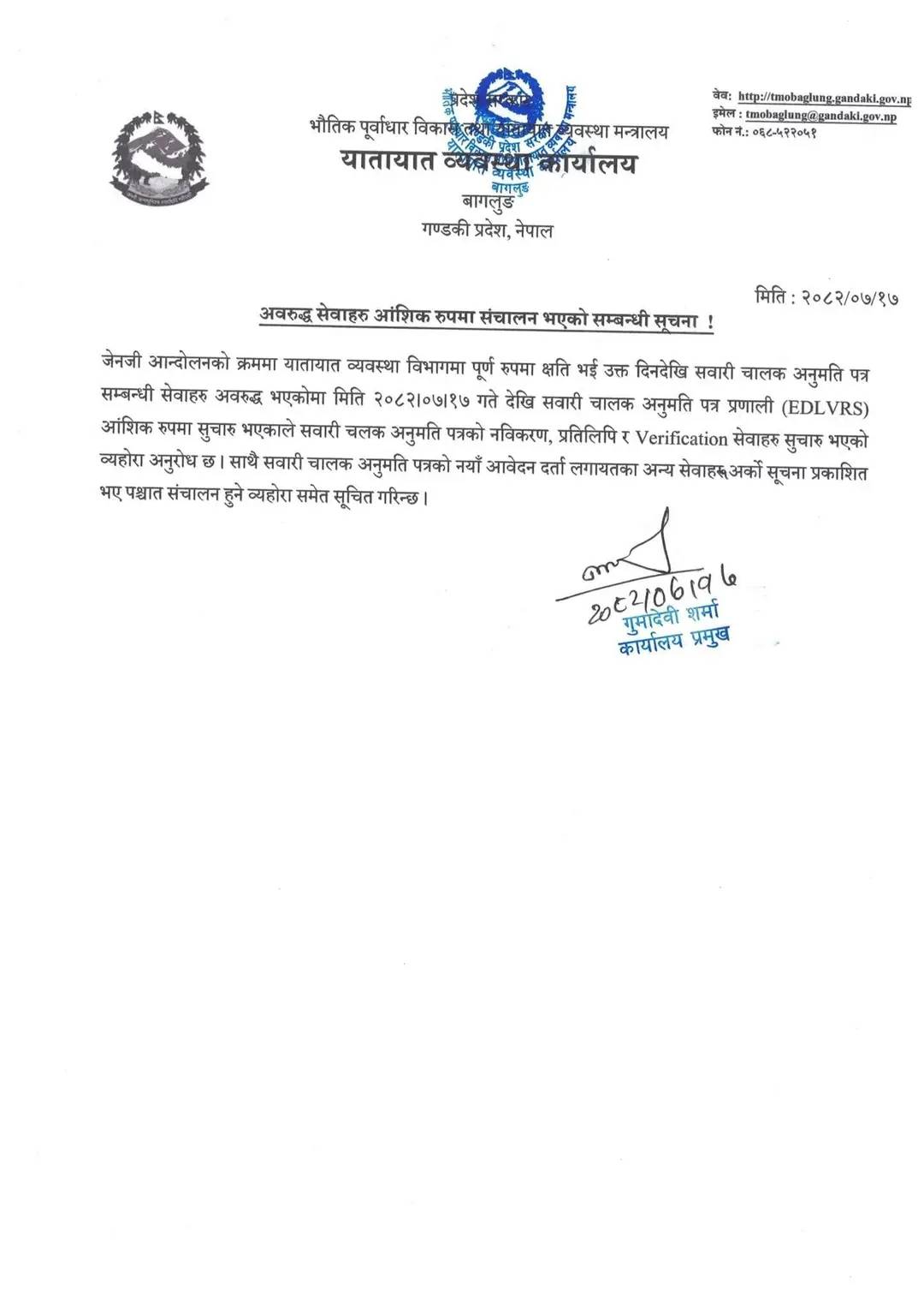 बागलुङको यातायात व्यवस्था कार्यालयका सेवाहरु सूचारु
