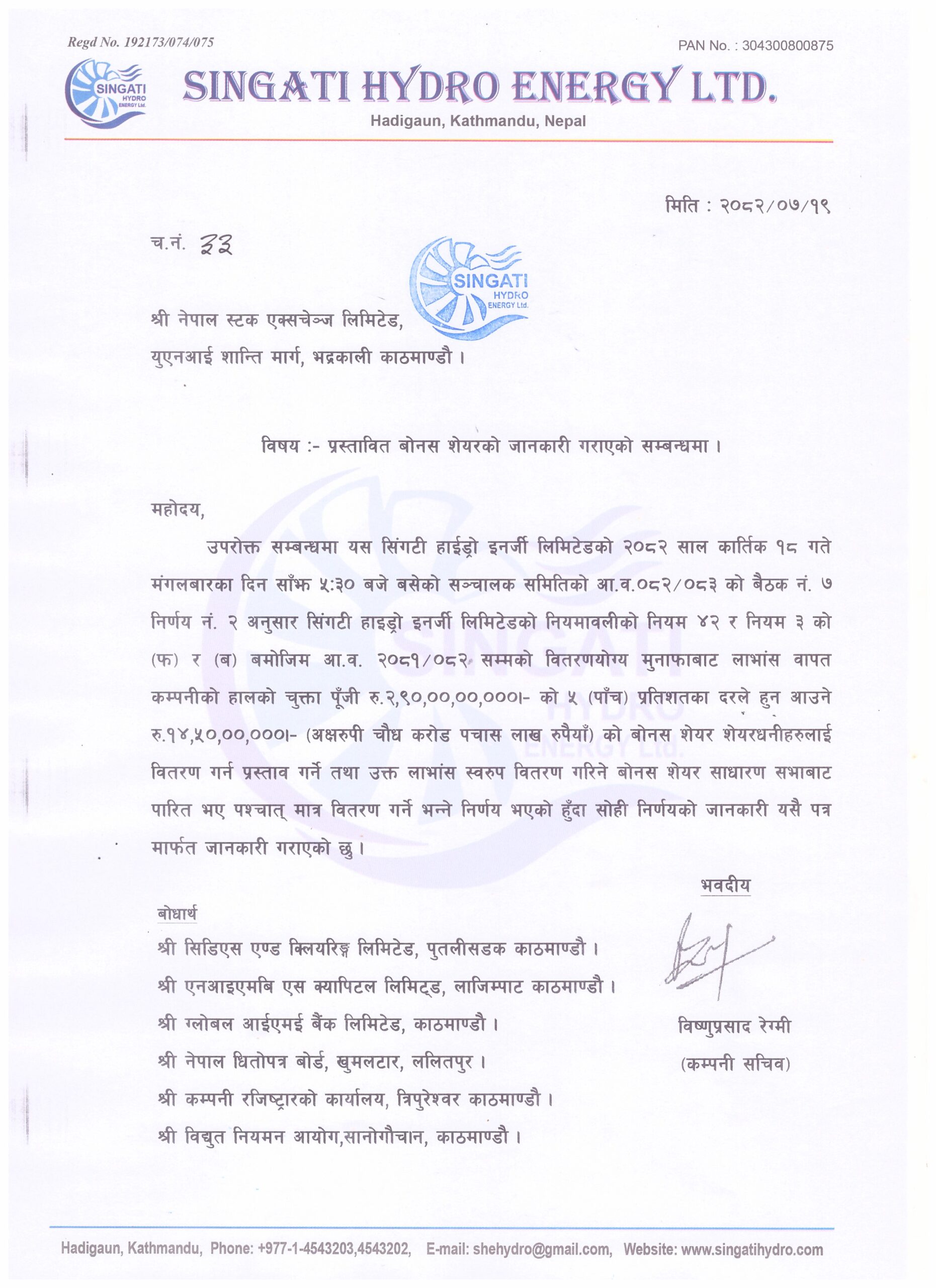 सिंगटी हाइड्रो इनर्जीको बोनस सेयर घोषणा