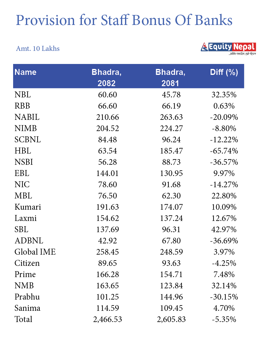 त्यसैगरी, नेपाल बैंकले ६ करोड ६ लाख, राष्ट्रिय वाणिज्य बैंकले ६ करोड ६६ लाख, स्टान्डर्ड चार्टर्डले ८ करोड ४४ लाख, हिमालयन बैंकले ६ करोड ३५ लाख, नेपाल एसबीआईले ५ करोड ६२ लाख, एनआइसी एसियाले ७ करोड ८६ लाख, माछापुच्छ्रे बैंकले ७ करोड ६५ लाख, कृषि विकास बैंकले ४ करोड २९ लाख, सिटिजन्सले ८ करोड ९६ लाख, प्रभुले १० करोड १२ लाख र सानिमा बैंकले आफ्ना कर्मचारीहरुका लागि बोनस बापत ११ करोड ४५ लाख रकम छुट्याएको छ ।