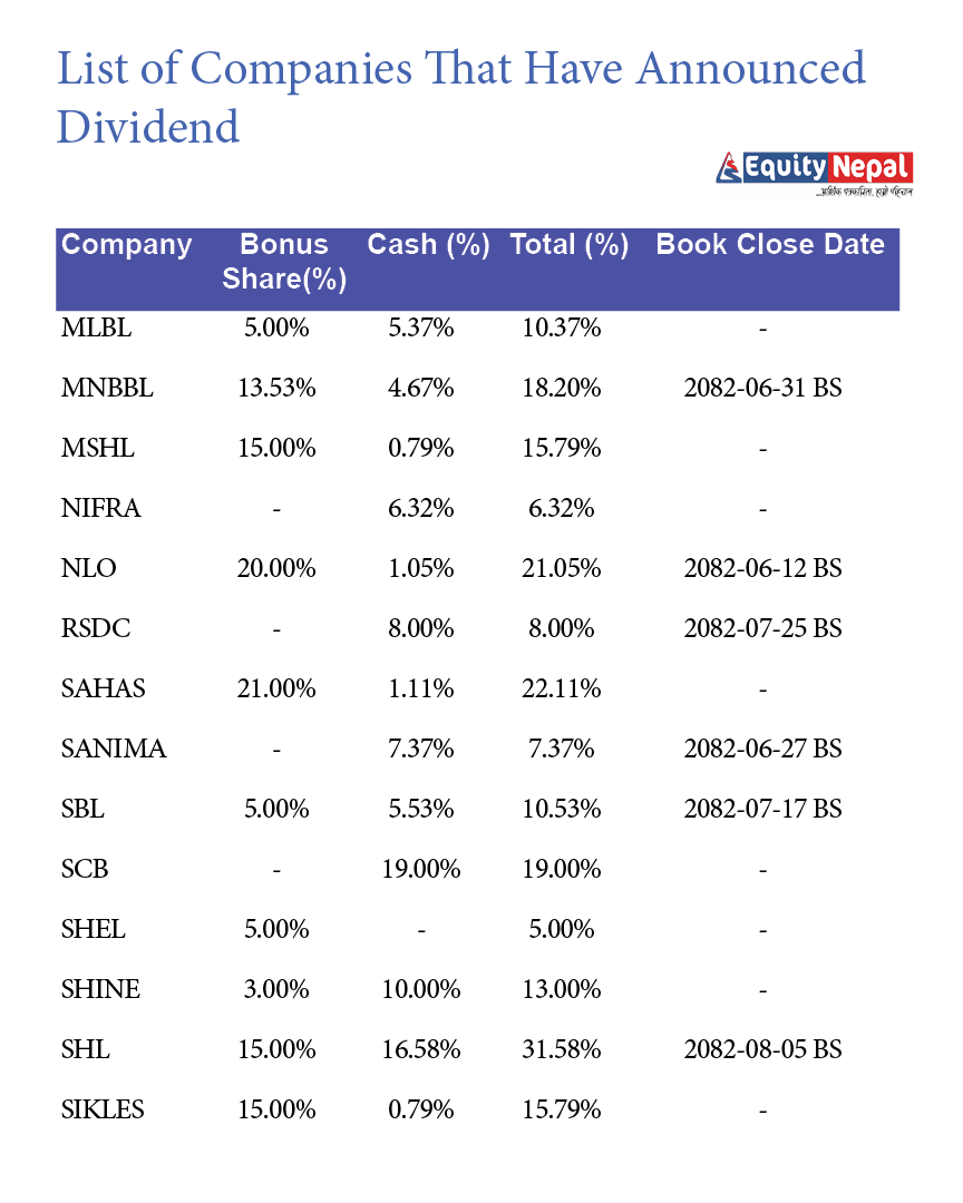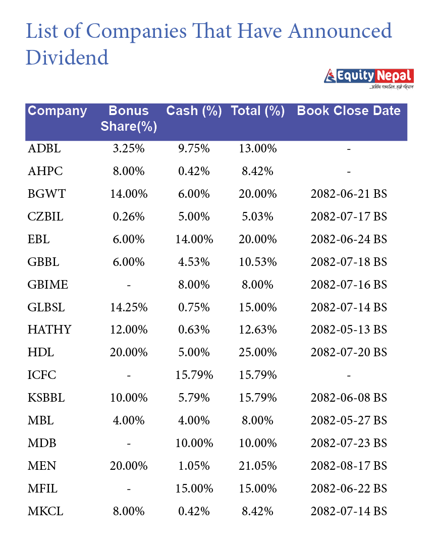 यी कम्पनीहरुमध्ये कृषि विकास बैंकले १३ प्रतिशत, अरुण भ्यालीले ८.४२ प्रतिशत, आइसीएफसी फाइनान्सले १५.७९ प्रतिशत, महालक्ष्मी विकास बैंकले १०.३७ प्रतिशत, मिड सोलुले १५.७९ प्रतिशत, निफ्राले ६.३२ प्रतिशत, साहस उर्जाले २२.११ प्रतिशत, स्टान्डर्ड चार्टर्डले १९ प्रतिशत, सिंगटीले ५ प्रतिशत, शाइन रेसुंगाले १३ प्रतिशत र सिक्लेसले १५.७९ प्रतिशत लाभांश प्रस्ताव गरेका छन् ।