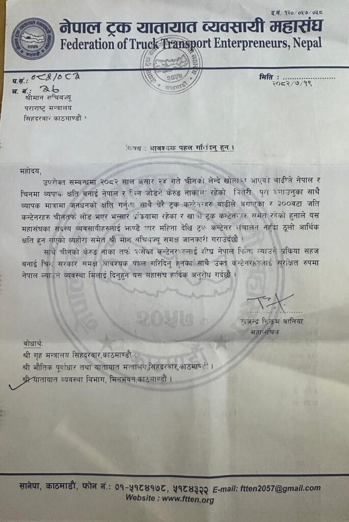 बाढीले जनधनसहित ठूलो संख्यामा ट्रक र कन्टेनरहरूमा क्षति पुगेयाएपछि नेपाल ट्रक यातायात व्यवसायी महासंघले बुधबार परराष्ट्र मन्त्रालयमा पत्र दिदैँ तत्काल आवश्यक पहल गर्न आग्रह गरेको छ।