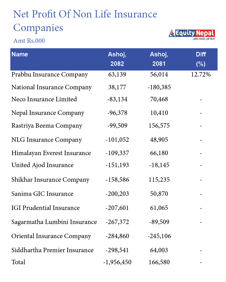 १४ कम्पनीहरुमध्ये १२ वटाले चालु आवको ३ महिनामा खुद घाटा व्यहोरेका छन् । यसअवधिसम्म २ वटाले मात्र नाफा आर्जन गरेका छन् । प्रभु र नेसनल इन्सुरेन्सले मात्र खुद नाफा कमाएका छन् । बाँकी कम्पनीहरु घाटामा छन् ।