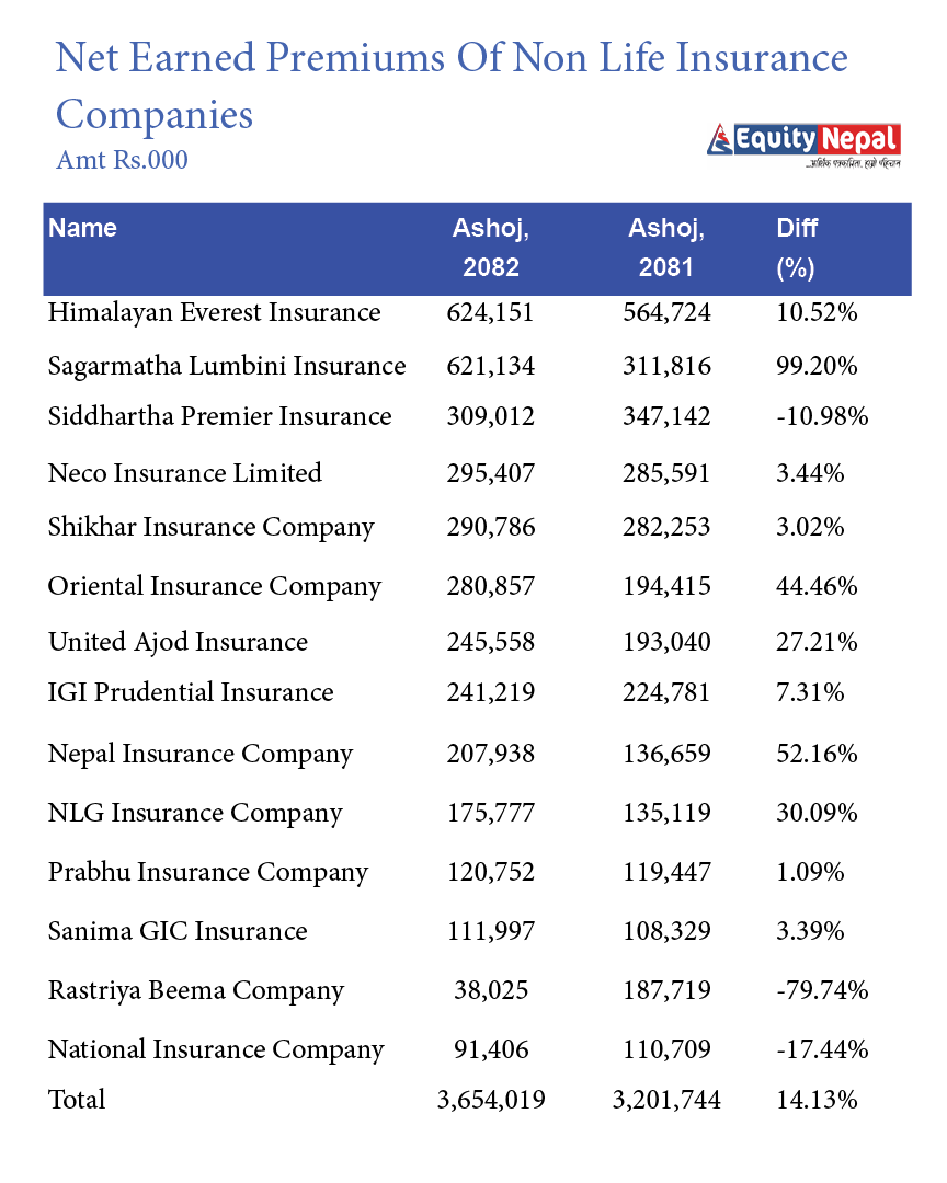 बिमा कम्पनीहरुले ३ महिनामा ३ अर्ब ६५ करोड रुपैयाँ बिमा शुल्क संकल गरेका छन् । यो गत वर्ष भन्दा १४.१३ प्रतिशत धेरै हो । गत वर्षको असोजमा कम्पनीहरुले ३ अर्ब २० करोड बिमा शुल्क संकलन गरेका थिए । जसमध्ये, हिमालयन एभरेष्ट इन्सुरेन्सले ६२ करोड ४१ लाख, सगरमाथा लुम्बिनीले ६२ करोड ११ लाख बिमा शुल्क संकलन गरेका छन् ।