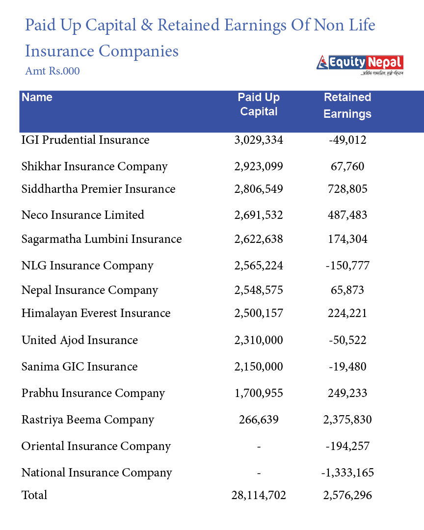 शिखरको २ अर्ब ९२ करोड, सिद्धार्थ प्रिमियरको २ अब ८० करोड र नेको इन्सुरेन्सको पुँजी २ अर्ब ६९ करोड छ । यता, राष्ट्रिय बिमा कम्पनीको रिटेन्ड अर्निङमा सबैभन्दा धेरै २ अर्ब ३७ करोड रुपैयाँ छ । ६ वटाको सञ्चित ऋणात्मक छ ।