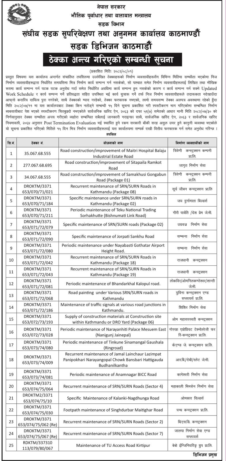 काठमाडौं । भौतिक पूर्वाधार तथा यातायात मन्त्रालय सडक विभाग अन्तर्गत संघीय सडक सुपरिवेक्षण तथा अनुगमन कार्यालय काठमाण्डौं सडक डिभिजन काठमाडौंले २५ वटा ठेक्का सम्झौता अन्त्य गरेको छ ।
