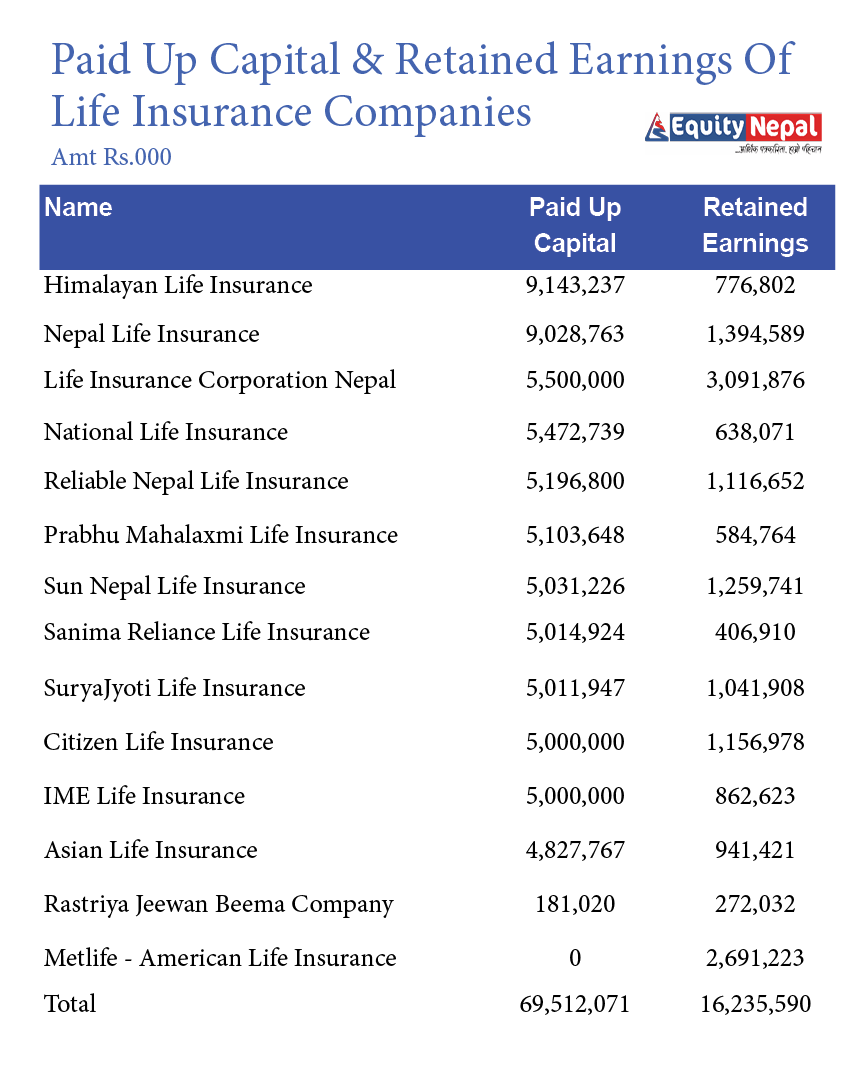 यता, रिटेन्ड अर्निङ भने लाइफ इन्सुरेन्स कर्पोरेसनको धेरै छ । यसको ३ अर्ब ९ करोड रुपैयाँ बराबरको सञ्चित कोष छ । समग्रमा जीवन बिमाहरुको १६ अर्ब २३ करोड रुपैयाँ बराबरको सञ्चति छ ।