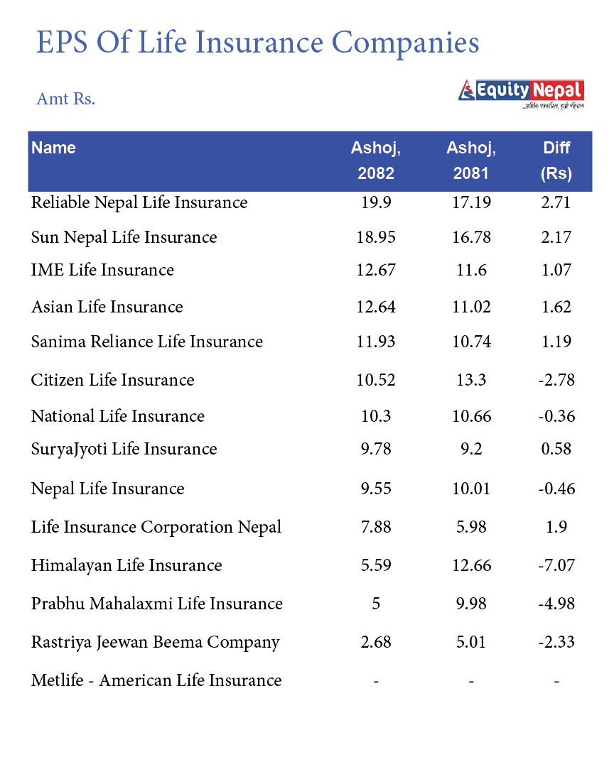 रिलायबल नेपालको प्रतिसेयर आम्दानी १९.९० रुपैयाँ रहेको छ । सन नेपालको १८.९५ रुपैयाँ छ । १४ मध्ये ७ वटाको इपीएस १० भन्दा धेरै छ ।