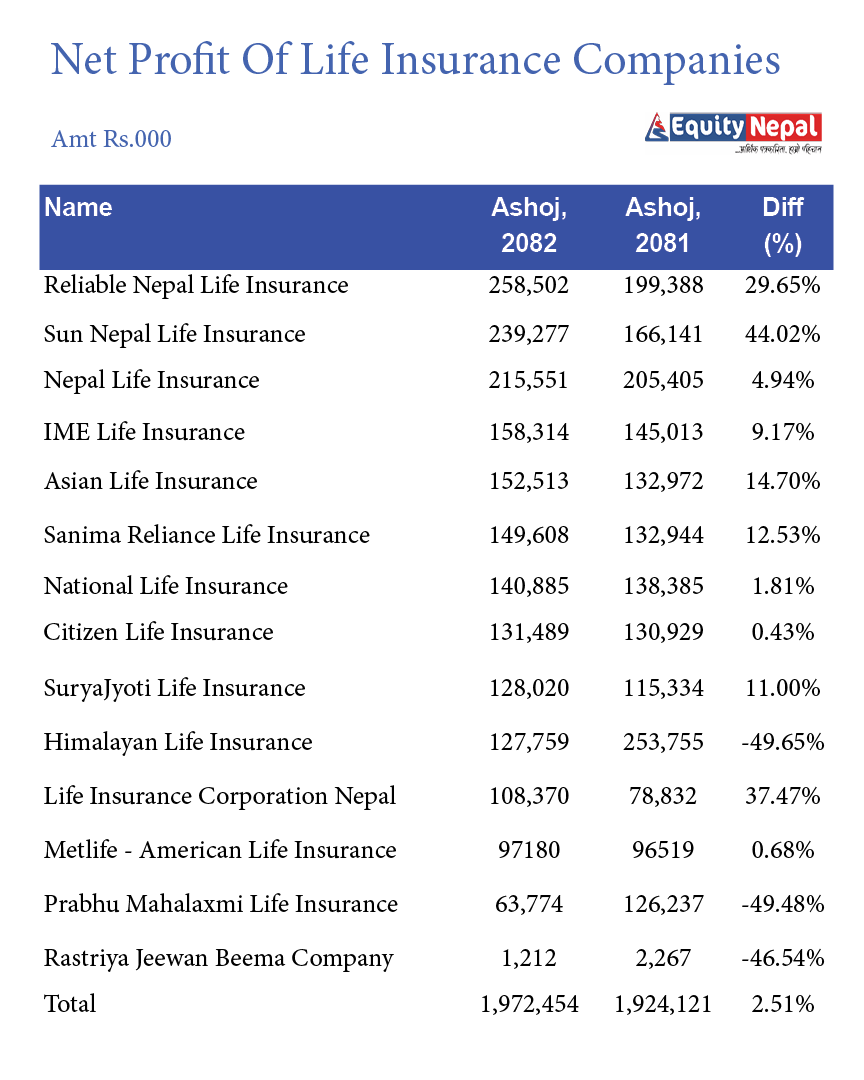 सबैभन्दा धेरै नाफा गर्नेमा रिलायबल नेपाल लाइफ इन्सुरेन्स परेको छ । यसले ३ महिनामा २५ करोड ८५ लाख रुपैयाँ नाफा कमाएको छ । सन नेपालले २३ करोड ९२ लाख नाफा आर्जन गरेको छ । समग्रमा बिमाहरुले १ अर्ब ९७ करोड रुपैयाँ नाफा कमाएका छन् ।