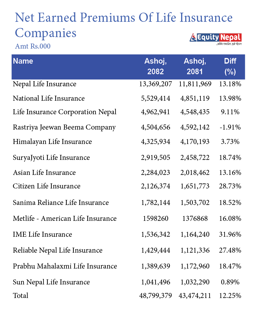 १४ वटा बिमा कम्पनीहरुले ३ महिनामा ४८ अर्ब ७९ करोड बिमा शुल्क संकलन गरेका छन् । यो गत वर्षको भन्दा १२.२५ प्रतिशत धेरै हो। बिमा शुल्क संकलन गर्नेमा नेपाल लाइफ अगाडि छ । यसले असोजसम्म १३ अर्ब ३६ करोड रुपैयाँ बराबरको बिमा शुल्क संकलन गरेको छ ।