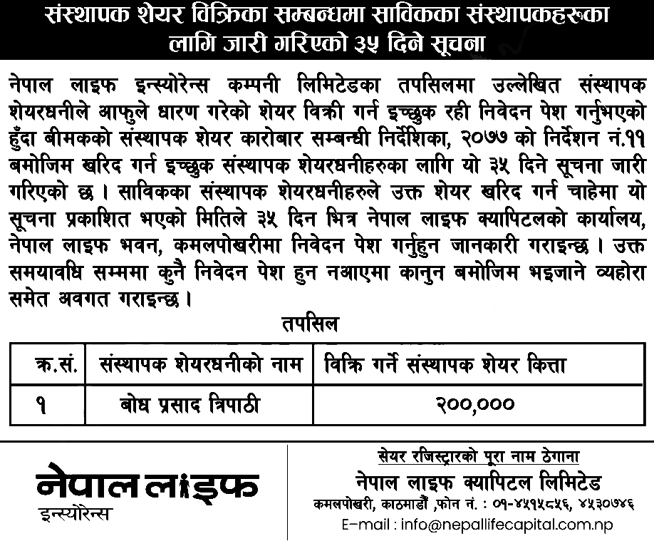 काठमाडौं । नेपाल लाइफ इन्स्योरेन्स कम्पनी लिमिटेडले संस्थापक सेयर बिक्रीमा राखेको छ । कम्पनीले सेयरधनी बोध प्रसाद त्रिपाठीको स्वामित्वमा रहेको २ लाख कित्ता संस्थापक सेयर बिक्रीमा राखेको हो ।