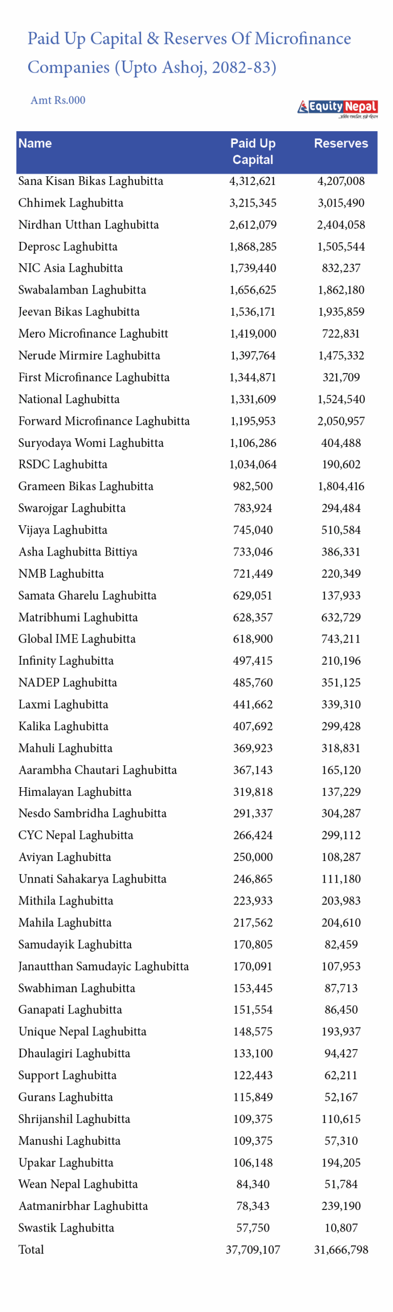 सूचीकृत ४९ लघुवित्त संस्थाहरुमध्ये साना किसान विकास लघुवित्तको चुक्ता पुँजी सबैभन्दा धेरै ४ अर्ब ३१ करोड रुपैयाँ रहेको छ । त्यस्तै, छिमेक लघुवित्तको ३ अर्ब २१ करोड, निर्धन उत्थानको २ अर्ब ६१ करोड रुपैयाँ चुक्ता पुँजी छ ।