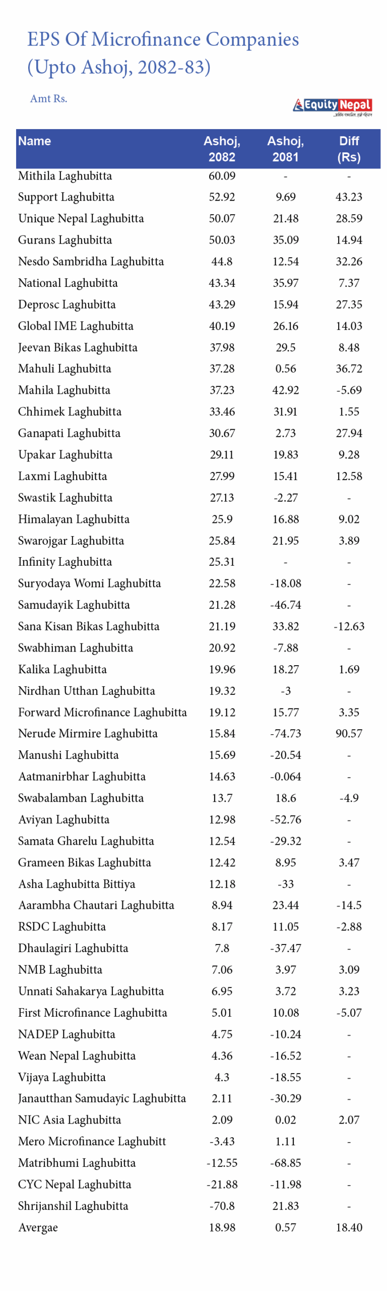 मिथिला लघुवित्तको प्रतिसेयर आम्दानी ६०.०९ रुपैयाँ छ । त्यस्तै, सपोर्टको ५२.९२ रुपैयाँ, युनिक नेपालको ५०.०७ र गुराँसको ५०.०३ रुपैयाँ प्रतिसेयर आम्दानी छ । लघिवत्त संस्थाहरुको औसत प्रतिसेयर आम्दानी १८.९८ रुपैयाँ छ ।