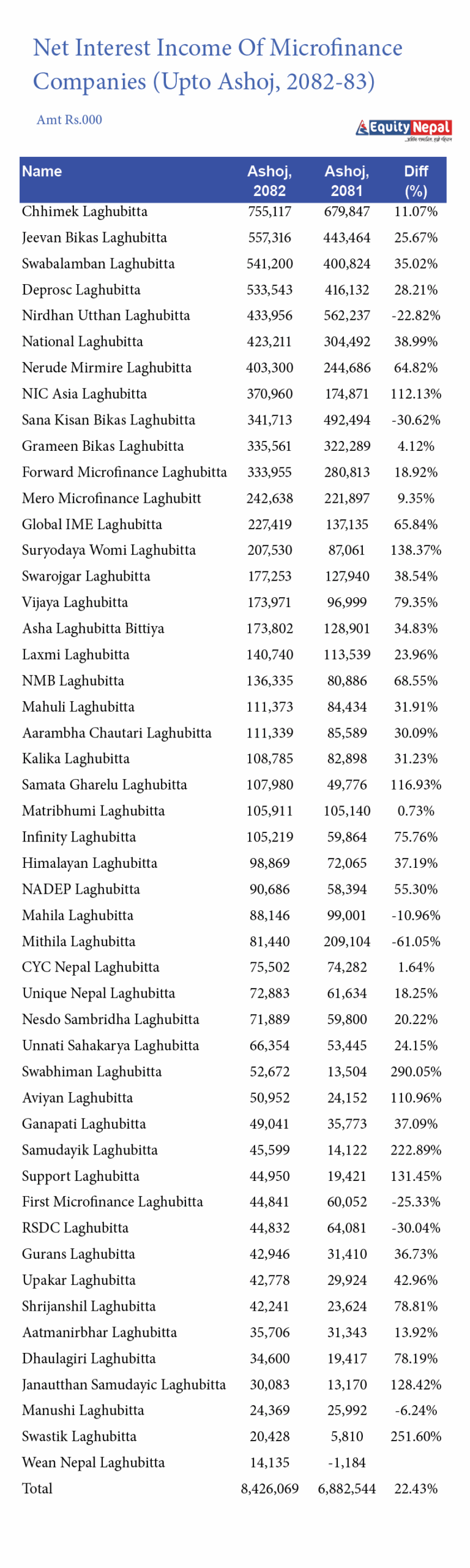 छिमेक लघुवित्तको खुद ब्याज आम्दानी ७५ करोड ५१ लाख रुपैयाँ रहेको छ । जीवन विकासको ५५ करोड ७३ लाख, स्वावलम्बनको ५४ करोड १२ लाख, डिप्रोक्सको ५३ करोड ३५ लाख रुपैयाँ खुद ब्याज आम्दानी रहेको छ । समग्रमा लघुवित्त संस्थाहरुको खुद ब्याज आम्दानी ८ अर्ब ४२ करोड छ ।