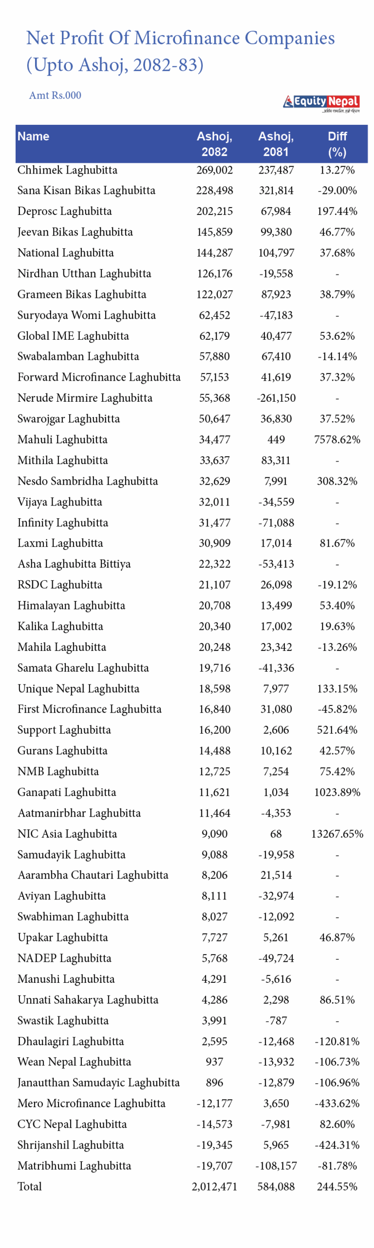 ३ महिनामा छिमेक लघुवित्तले सबैभन्दा धेरै २६ करोड ९० लाख नाफा कमाएको छ । साना किसानले २२ करोड ८४ लाख र डिप्रोक्सले २० करोड २२ लाख नाफा आर्जन गरेको छ । ४९ कम्पनीहरुले ३ महिनामा २ अर्ब १ करोड नाफा कमाएका छन् ।