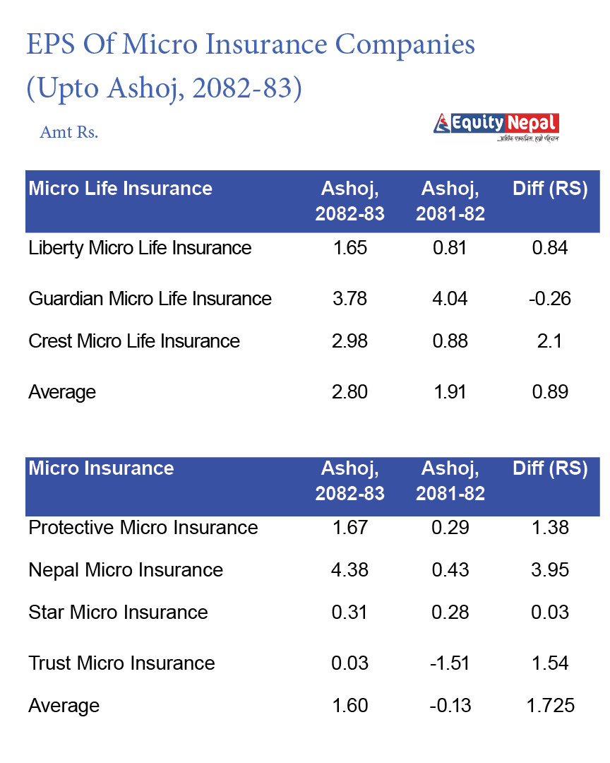 लघु बिमा कम्पनीहरुमध्ये नेपाल माइक्रो इन्सुरेन्सको प्रतिसेयर आम्दानी ४.३८ रुपैयाँ रहेको छ । औसतमा लघु जीवन बिमा कम्पनीहरुको प्रतिसेयर आम्दानी २.८० रुपैयाँ र लघु निर्जीवन बिमा कम्पनीहरुको इपीएस १.६० रुपैयाँ छ ।