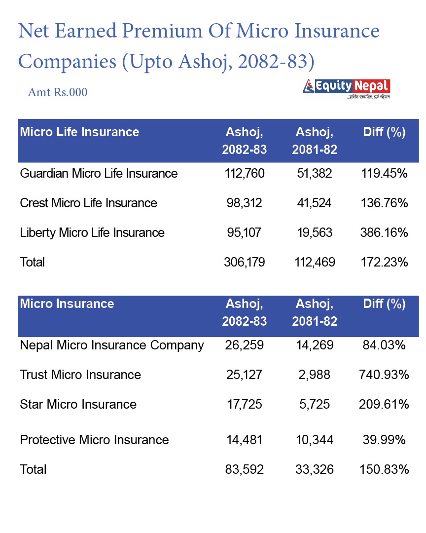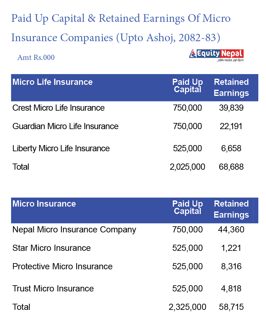 सञ्चालनमा रहेका ३ लघु जीवन बिमा कम्पनीहुको चुक्ता पुँजी २ अर्ब २ करोड रुपैयाँ रहेको छ भने रिटेन्ड अर्निङमा ६ करोड ८६ लाख जम्मा छ । क्रेष्ट र गार्डियन माइक्रो लाइफको चुक्ता पुँजी ७५ करोड छ भने लिबर्टीको ५२ करोड ५० लाख रुपैयाँ छ । रिटेन्ड अर्निङमा क्रेष्टको ३ करोड ९८ लाख, गार्डियनको २ करोड २१ लाख रुपैयाँ छ ।