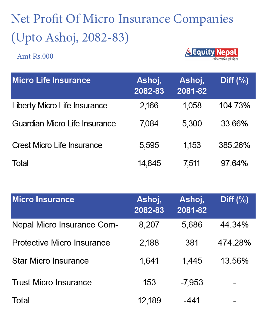 लघु बिमा कम्पनीहरुले असोजसम्म २ करोड ७० लाख रुपैयाँ नाफा कमाएका छन् । यो गत वर्षको भन्दा २८२ प्रतिशत धेरै हो । जसमध्ये लघु जीवन बिमाहरुले १ करोड ४८ लाख र निर्जीवन बिमाहरुले १ करोड २१ लाख नाफा कमाएका छन् ।