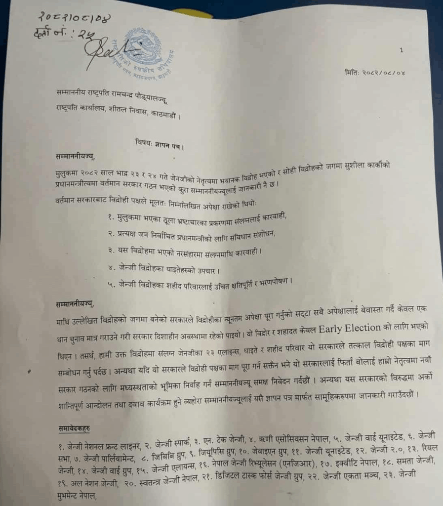 जेन्जी नेशनल फ्रन्ट लाइनर, जेन्जी स्पार्क, एनटेक जेन्जी, ऋणी एसोसियसन नेपाल, जेन्जी वाई यूनाइटेड, जेन्जी सभा, जेन्जी पार्लियामेन्ट, जीबीबी ग्रुप, जीयूपीसी ग्रुप, जेबाइएन ग्रुप, जेन्जी यूनाइटेड, जेन्जी २.०, रियल जेन्जी, जेन्जी वाई ग्रुप, जेन्जी एलायन्स, नेपाल जेन्जी रिभ्यूलेसन (एनजीआर), इक्वीटि नेपाल, समता जेन्जी, अल नेशन जेन्जी, स्वतन्त्र जेन्जी नेपाल, डिजिटल टास्क फोर्स जेन्जी ग्रुप, जेन्जी एकता मञ्च, र जेन्जी मुभमेन्ट नेपालले संयुक्त रूपमा राष्ट्रपतिलाई ज्ञापनपत्र बुझाएका हुन् ।