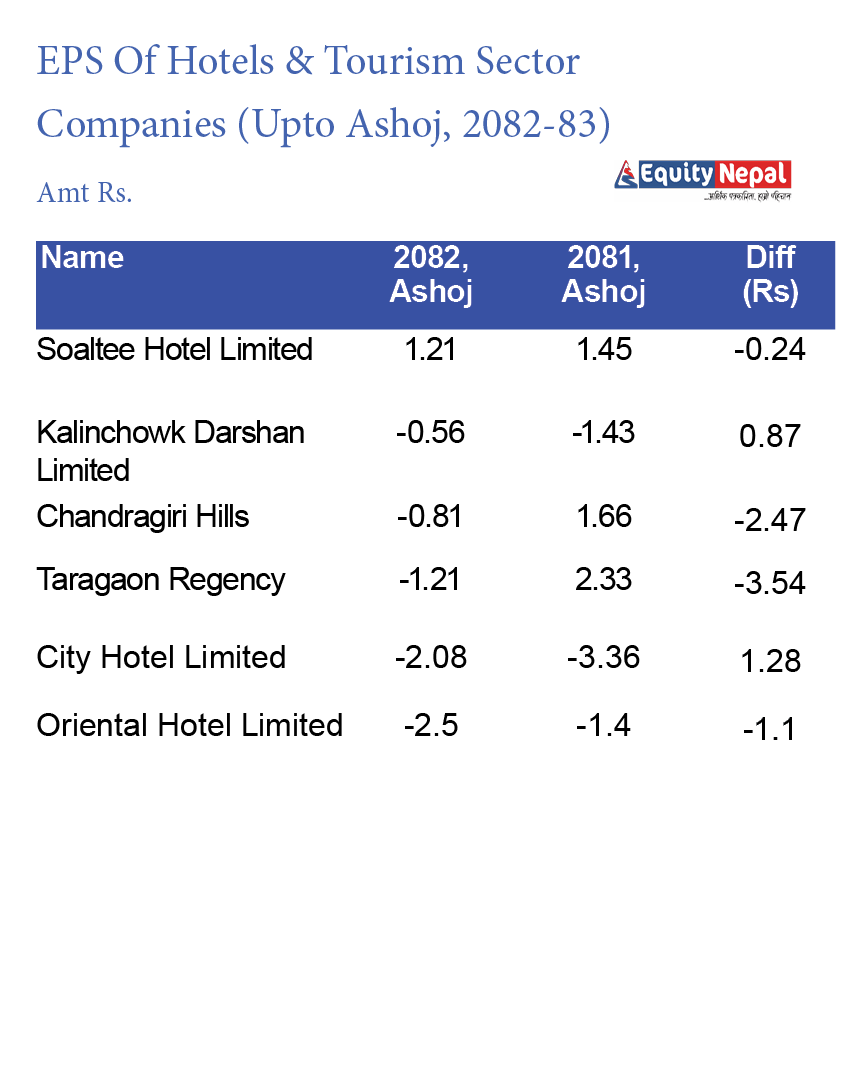 काठमाडौं । चालु आवको पहिलो त्रैमाससम्म होटल्स तथा पर्टयन समूहका कम्पनीहरुले ११ लाख ८० हजार रुपैयाँ खुद घाटा व्यहोरा छन् । गत वर्षको असोजसम्म यी कम्पनीहरुले १२ करोड ५३ लाख रुपैयाँ नाफा कमाएका थिए ।