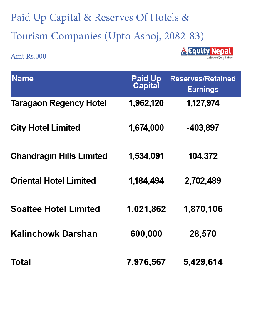 तारागाउँ रिजेन्सी होटलको चुक्ता पुँजी सबैभन्दा धेरै १ अर्ब ९६ करोड रुपैयाँ बराबर रहेको छ । त्यस्तै, सिटीको १ अब ६७ करोड ४० लाख, चन्द्रागिरी हिल्सको १ अर्ब ५३ करोड रुपैयाँ बराबरको पुँजी रहेको छ । समग्रमा होटल्स तथा पर्यटन समूहका कम्पनीहरुको चुक्ता पुँजी ७ अर्ब ९७ करोड ६५ लाख रहेको छ ।