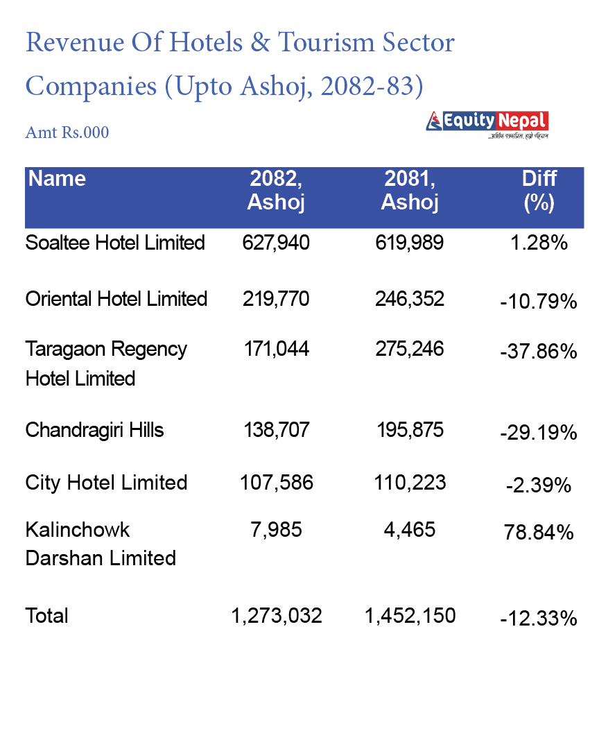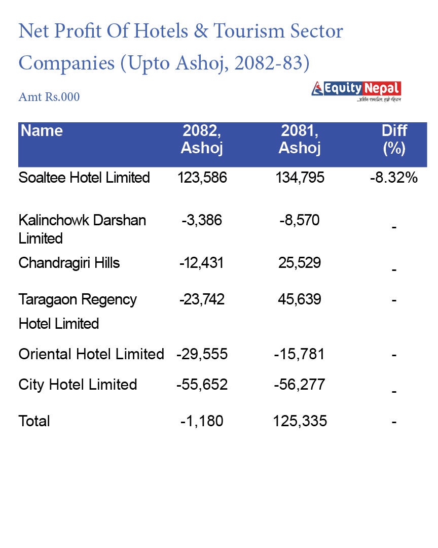 होटल तथा पर्यटन समूहका कम्पनीले ३ महिनामा ११ लाख ८० हजार खुद घाटा व्यहोरेका छन् । गत वर्ष कम्पनीहरुले १२ करोड ५३ लाख नाफा कमाएका थिए । रिपोर्ट सार्वजनि गर्ने ५ वटा कम्पनी घाटामा छन् । सोल्टी होटलले भने १२ करोड ३५ लाख नाफा कमाएको छ ।