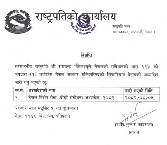 काठमाडौं । राष्ट्रपति रामचन्द्र पौडेलले नेपाल विशेष सेवा ऐन २०४२ लाई संशोधन गर्न बनेको अध्यादेश जारी गरेका छन् । नेपाल विशेष सेवा ऐन दोस्रो संशोधन अध्यादेश, २०८२ जारी भएको राष्ट्रपति कार्यालयले जनाएको छ । मंगलबार बसेको मन्त्रिपरिषद् बैठकले अध्यादेश जारी गर्न राष्ट्रपति पौडेलसमक्ष सिफारिस गरेको थियो । सोही अनुसार ‘नेपाल विशेष सेवा ऐन २०४२ लाई संशोधन गर्न बनेको अध्यादेश’ राष्ट्रपति पौडेलले जारी गरेका हुन् ।