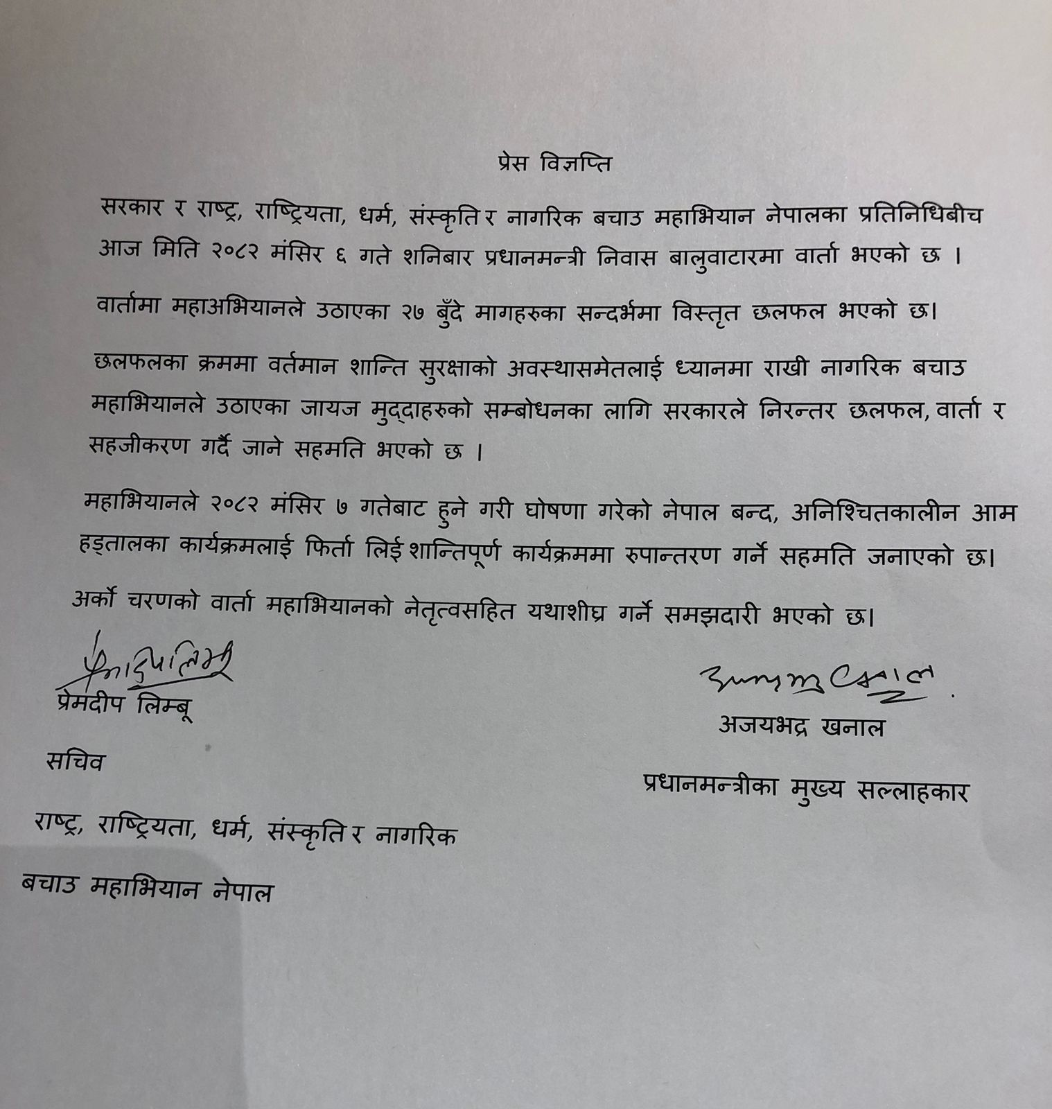 प्रधानमन्त्री शुसीला कार्कीको सचिवालयले दिएको जानकारी अनुसार वार्तामा महाअभियानले उठाएका २७ बुँदे मागहरुका सन्दर्भमा विस्तृत छलफल भएको छ। छलफलका क्रममा वर्तमान शान्ति सुरक्षाको अवस्थासमेतलाई ध्यानमा राखी नागरिक बचाउ महाभियानले उठाएका मुद्दाहरुको सम्बोधनका लागि सरकारले निरन्तर छलफल, वार्ता र सहजीकरण गर्दै जाने सहमति भएको हो ।
