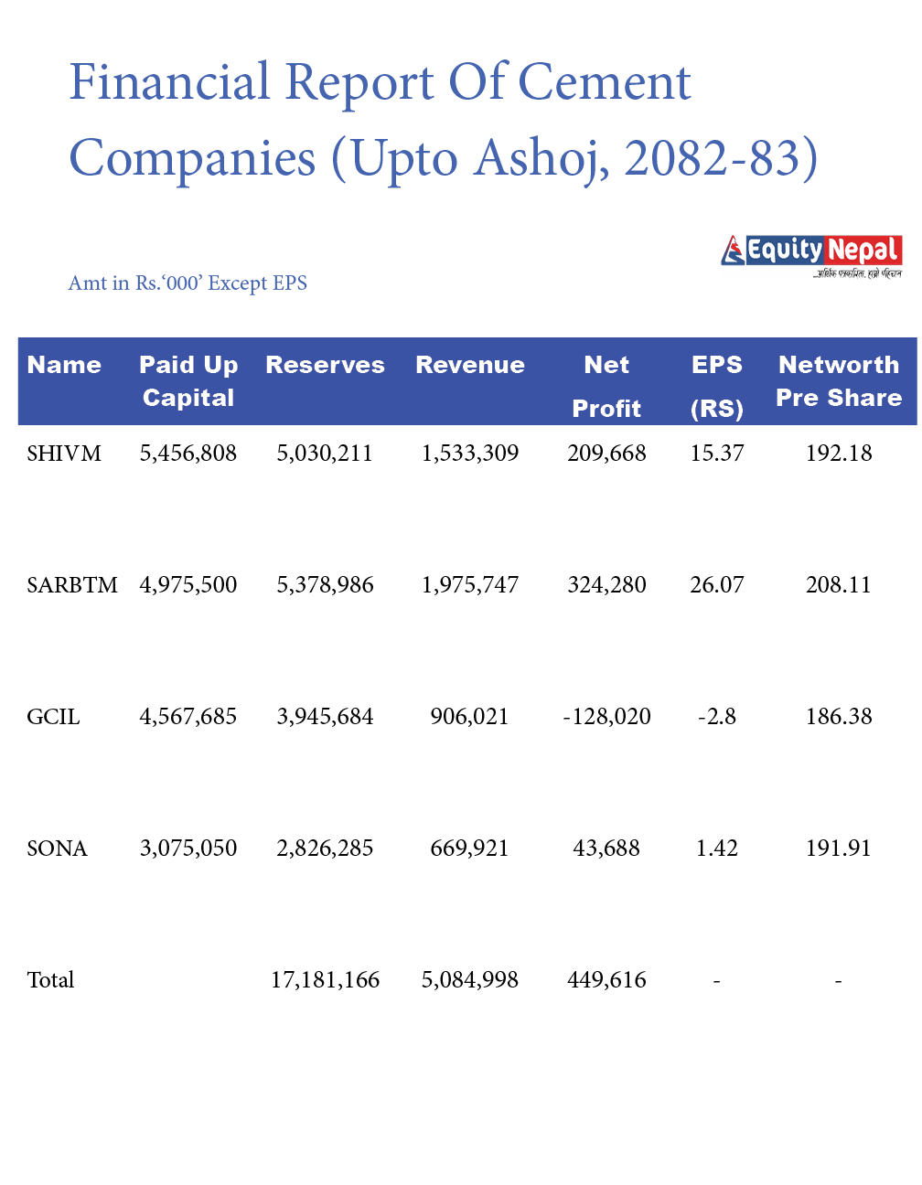 चुक्ता पुँजी समग्रमा १८ अर्ब ७ करोड ५० लाख रुपैयाँ रहेको सिमेन्ट कम्पनीहरुको जगेडा कोषमा (सञ्चित र सेयर प्रिमियम)मा १७ अर्ब १८ करोड रुपैयाँ रहेको छ । शिवम् सिमेन्ट्स र सर्वोत्तमको जगेडामा ५ अर्ब भन्द धेरै रकम जम्मा छ । घोराही र सोनापुरको भने जगेडमा क्रमशः ३ अर्ब ९४ करोड र २ अर्ब ८२ करोड देखिएको छ ।