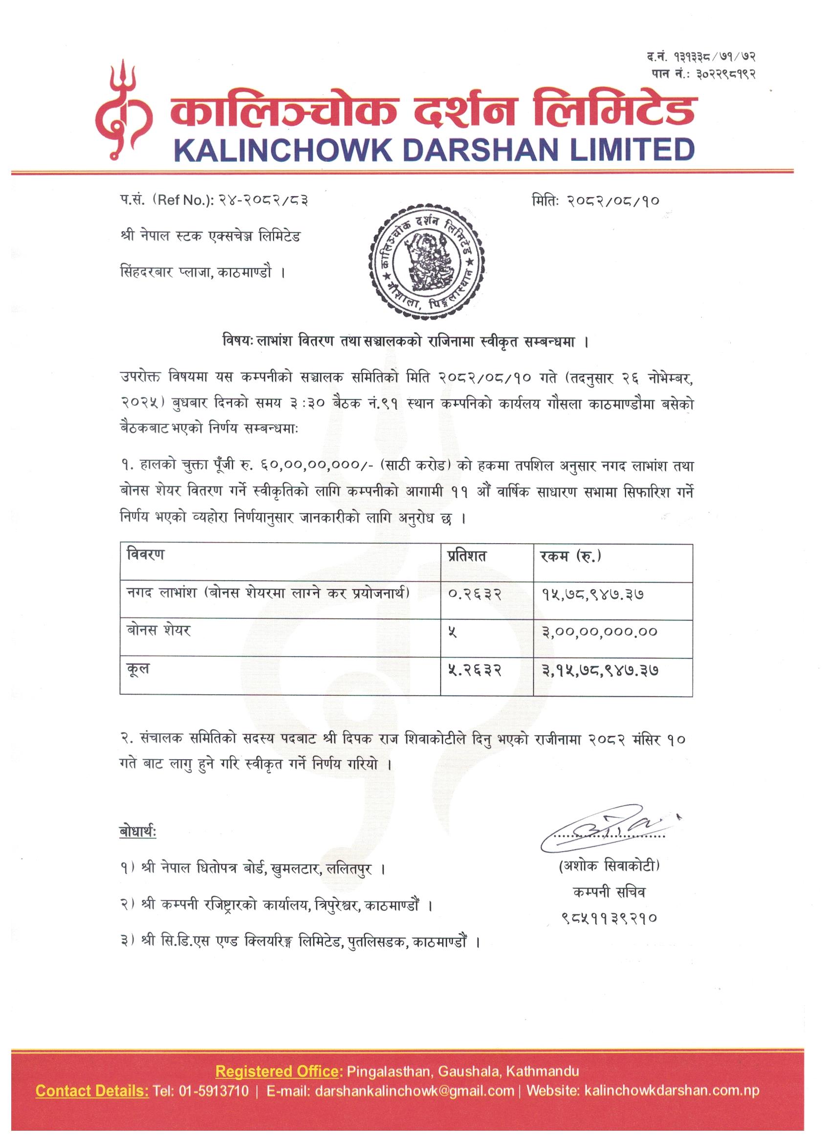 कालिञ्चोक दर्शनको लाभांश घोषणा
