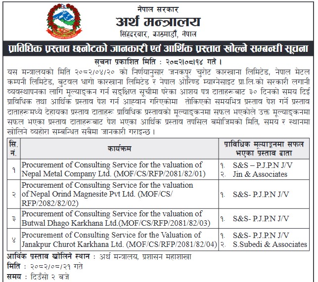 यसअधिघ मन्त्रालयले जनकपुर चुरोट कारखानाका लागि ८ वटा, नेपाल ओरियण्ड म्याग्नेसाइटका लागि ११ वटा, बुटवल धागो कारखानाका लागि १२ वटा र नेपाल मेटल कम्पनीको सम्पत्ति मूल्यांकनका लागि ११ वटा कन्सल्टिङ कम्पनीलाई सर्टलिष्टमा छनौट गरेको थियो ।