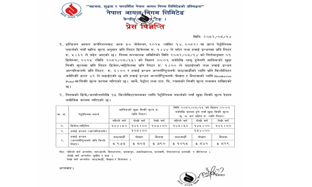 इन्डियन आयल कर्पोरेसनबाट प्राप्त पेट्रोलियम पदार्थको नयाँ खरिद मूल्यअनुसार डिजेल÷मट्टितेलमा प्रतिलिटर १ रुपैयाँ ४४ पैसा घटेर तथा हवाई इन्धनमा प्रतिलिटर ५ रुपैयाँ ६२ पैसा बढेर आएकाले खुद्रा बिक्री मूल्य समायोजन गरिएको निगमको भनाइ छ ।