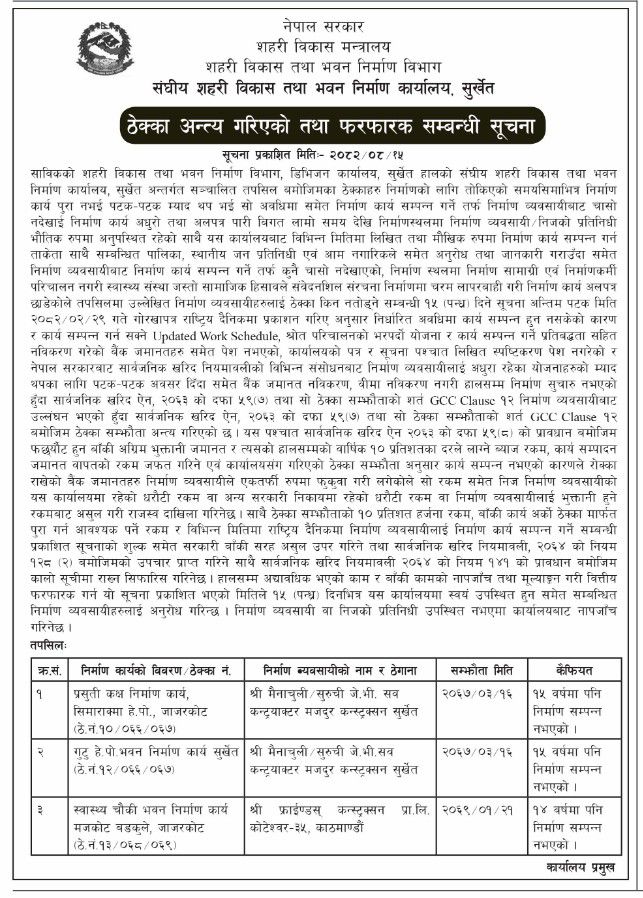 सुर्खेत र जाजरकोटका ३ निर्माण ठेक्का रद्द