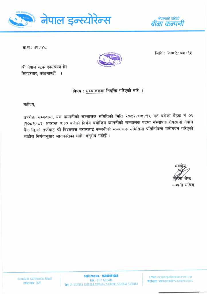 कम्पनीको मंसिर १५ गते अपरान्ह साढे ४ बजे बसेको सञ्चालक समितिको बैठकले कम्पनीको सञ्चालक पदमा संस्थापक शेयरधनी नेपाल बैंक लिमिटेडको तर्फबाट बराललाई नियुक्त गर्ने निर्णय गरेको हो।